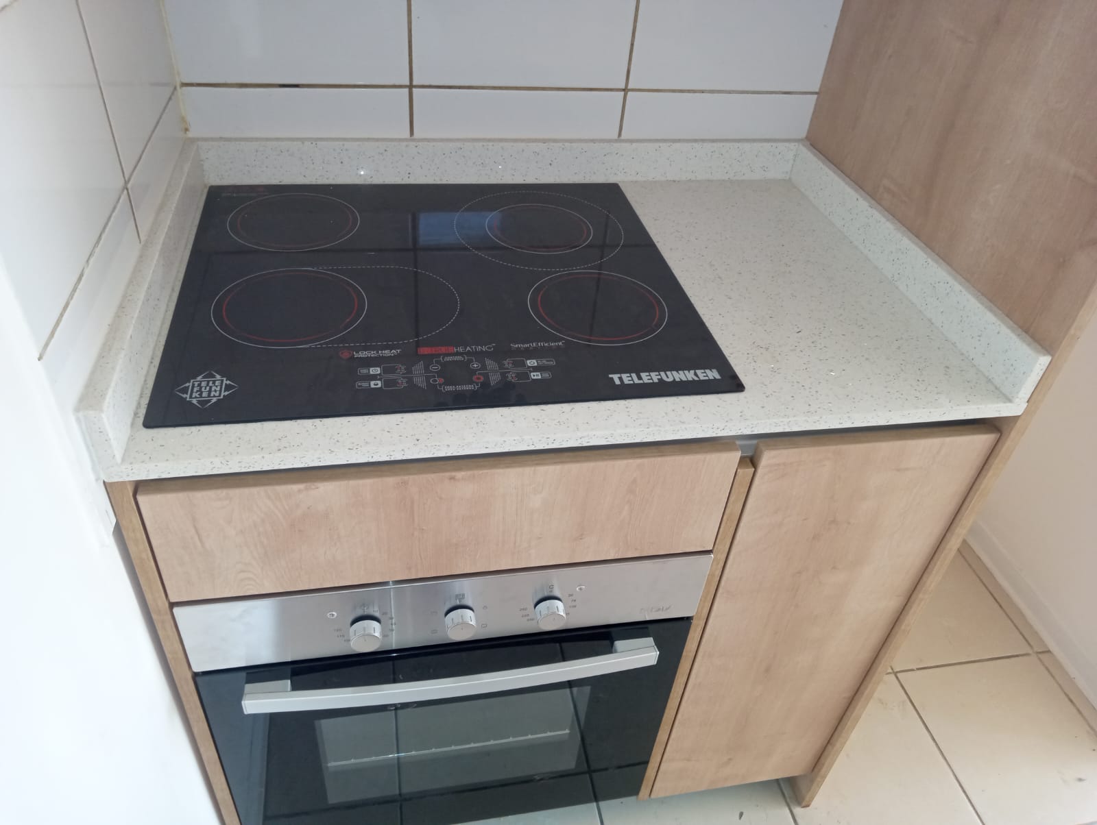 El acceso desde el dormitorio auxiliar hacia el área común muestra una cocina moderna bien conservada y equipada con encimera vitrocerámica y horno empotrado, con muebles en tonos madera clara que brindan calidez y funcionalidad, ideal para atraer arrendatarios exigentes y elevar el valor de arriendo, cuenta con mobiliario moderno y disposición práctica, ideal para quienes buscan funcionalidad y bajo costo de mantenimiento.